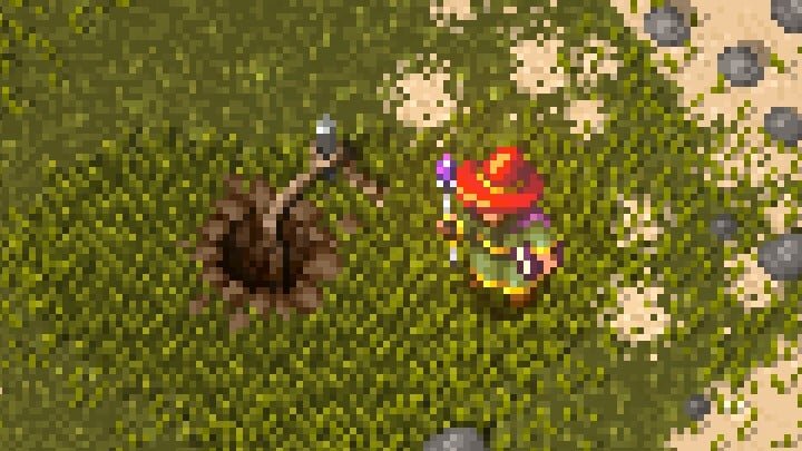 Веревку можно использовать только в специальных местах – отверстиях, или натягивать между вбитыми кольями. Если вы видите брешь в земле (как показано ниже), вы можете использовать веревку, чтобы получить доступ к новому месту. Вы можете найти такие места, например, после того, как срубите мертвые деревья (для этого вам понадобится топор). К сожалению, этот предмет одноразовый. Таким образом, вам придется всегда иметь хотя бы одну веревку в вашем инвентаре.